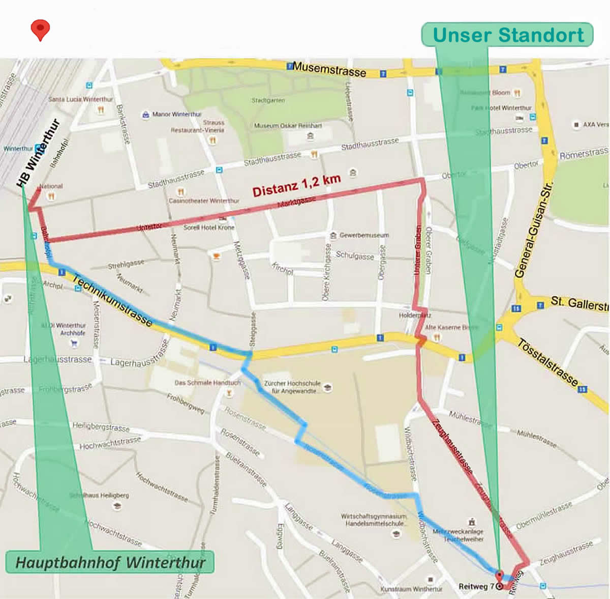 Zwei Fusswege vom HB Winterthur zu uns